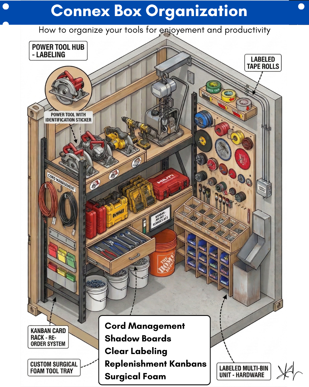 Here is the practical challenge. Walk your current project’s connex boxes this week not to inspect people, but to evaluate the system. Open every drawer. Ask: does every tool have a labeled home? Is every piece of hardware sorted and labeled by type? Are cords managed so they’re immediately usable? Is there a system that signals when consumables are getting low? Is a new worker able to find what they need within sixty seconds without asking anyone?