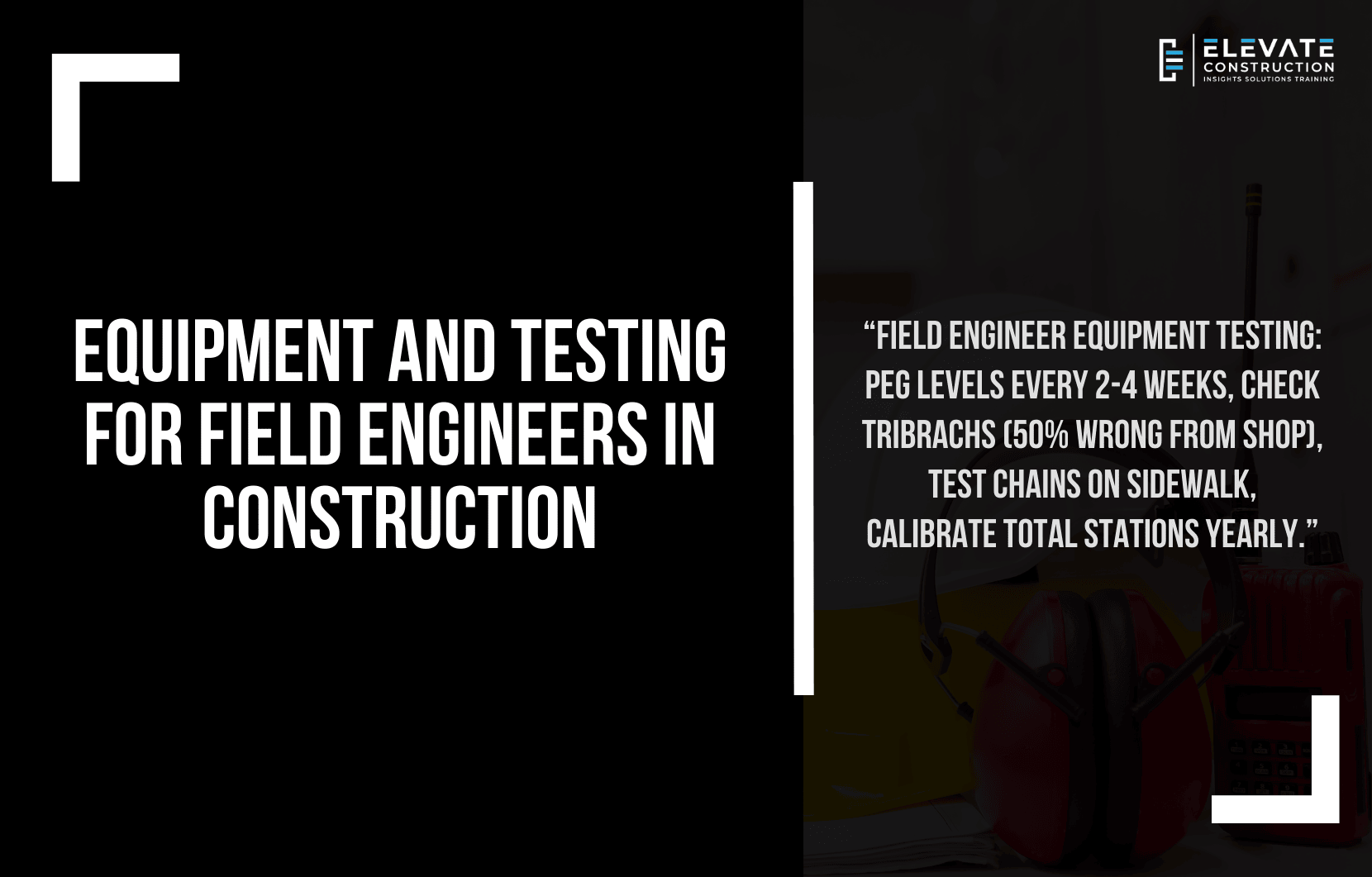 And if you want more details, it’s in the Field Engineering Methods Manual. You got to make sure that you’re using your equipment in a tested and calibrated manner. As we say at Elevate, field engineer equipment testing: peg levels every 2-4 weeks, check tribrachs (50% wrong from shop), test chains on sidewalk, calibrate total stations yearly.