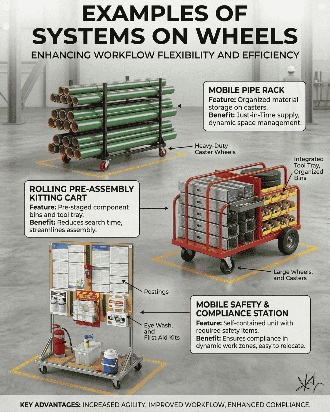 It’s point-of-use storage applied to a mobile workforce. Since construction work moves through zones, the systems that support it materials, tools, safety stations should move with it rather than stay fixed. This eliminates the motion, transportation, and waiting waste created when crews have to travel away from their work area to get what they need.