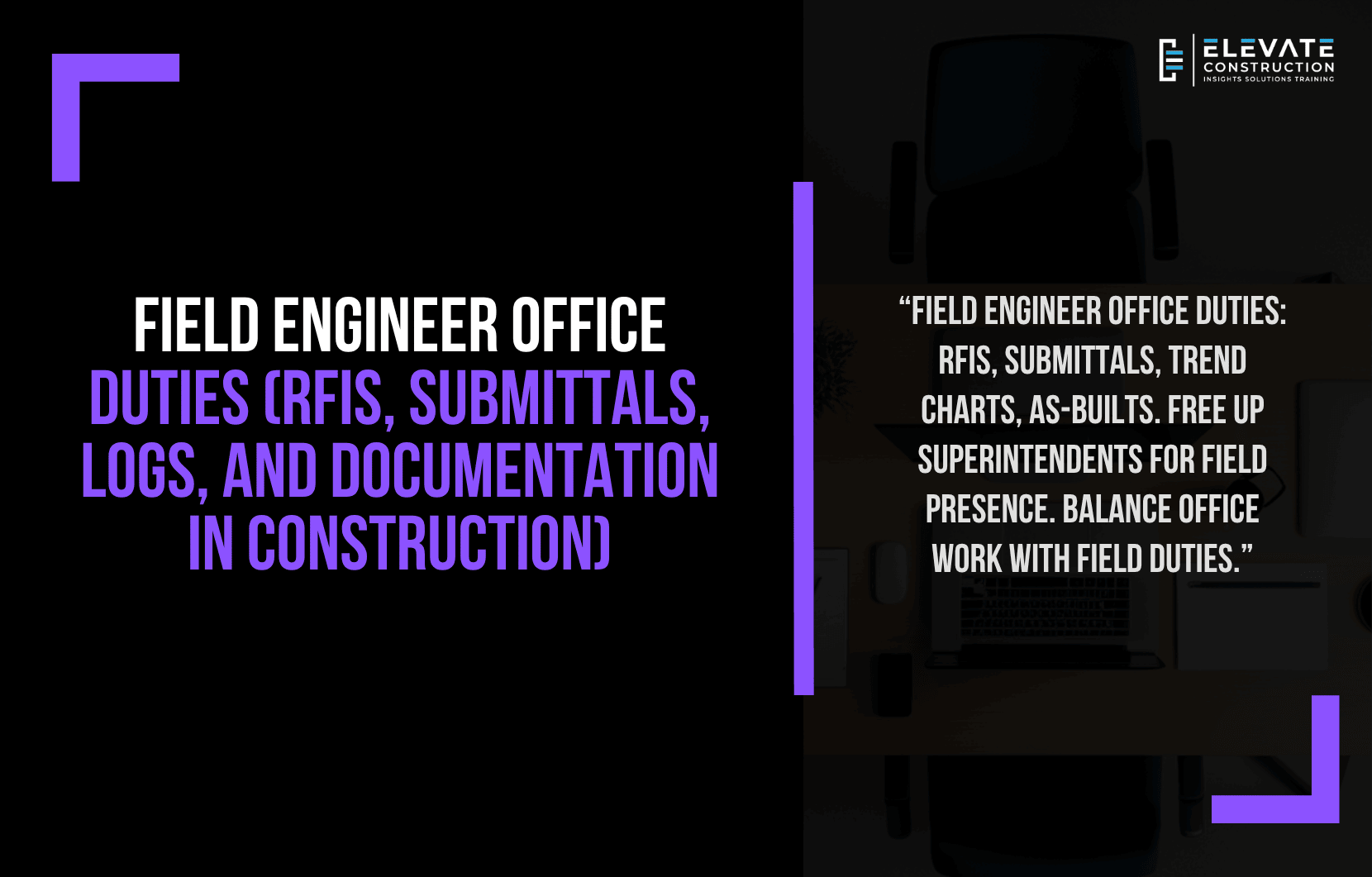 Send trades to you for RFI and submittal questions so superintendents can stay focused. Superintendents need to be safety presence in field, quality presence in field, plan and execute work. Need areas perfectly clean, perfectly safe, organized, trades flowing. As we say at Elevate, field engineer office duties: RFIs, submittals, trend charts, as-builts. Free up superintendents for field presence. Balance office work with field duties.