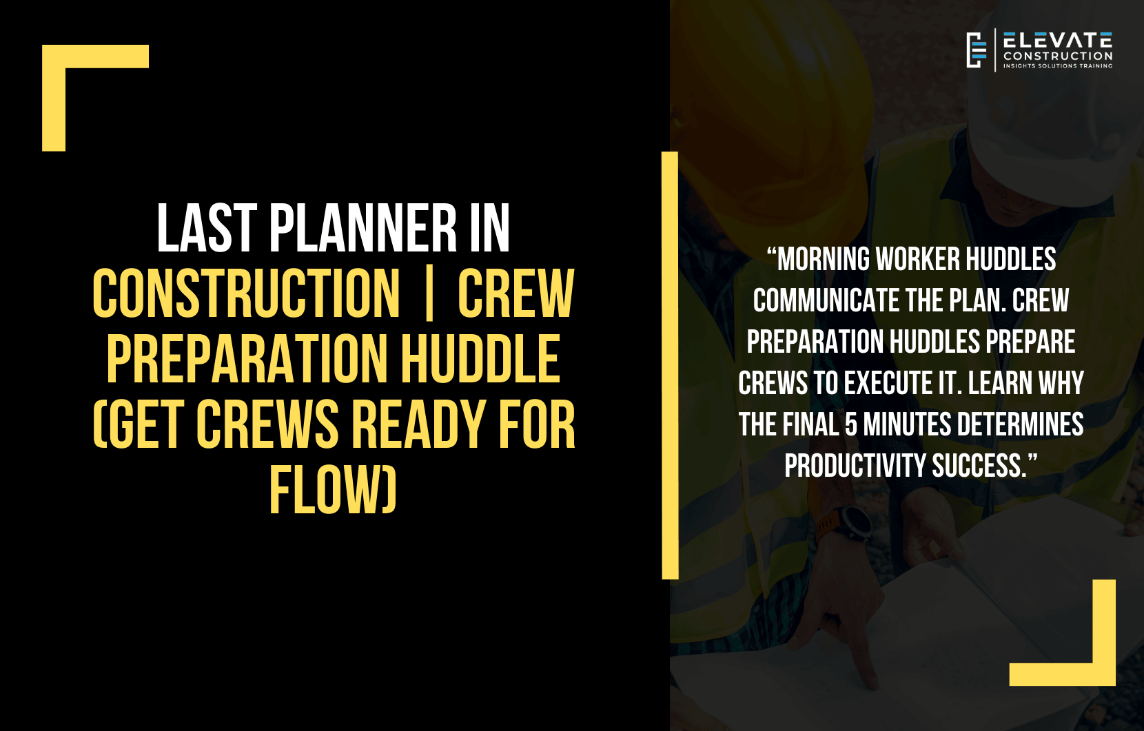 If your project needs help implementing crew preparation huddles that complete information delivery to workers, if your planning drowns 5 feet from shore because crews don’t have zone-level orientation, if you want to implement Paul Akers 2 Second Lean method in construction through crew boards and daily improvement, Elevate Construction can help your teams get information all the way to execution through visual boards, proper huddle structure, and 5S workspace organization.