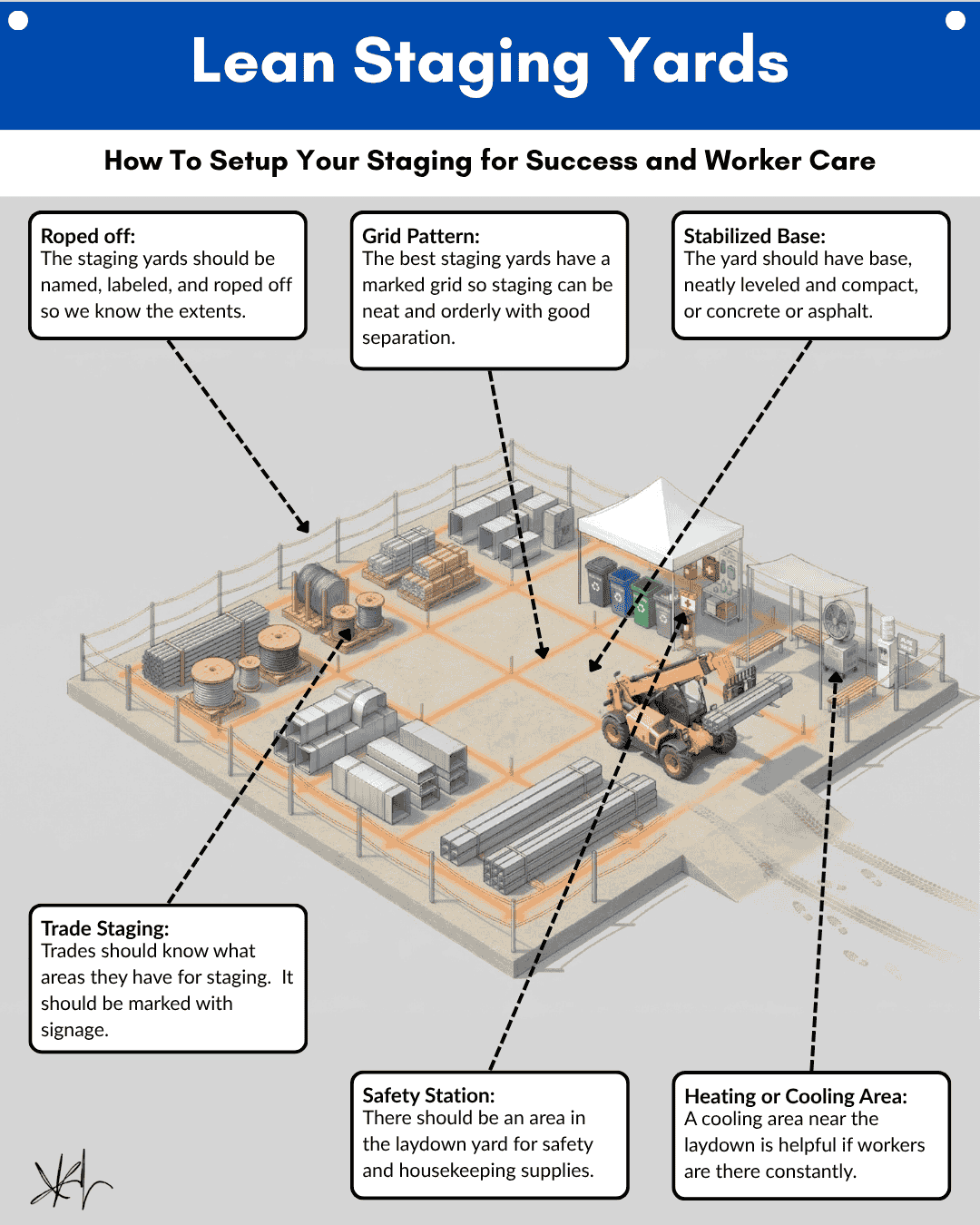 Here is the challenge for every superintendent and project team reading this. Pull up the logistics plan for your next project and look specifically at the staging yard layout. Ask: does every trade know exactly where their staging area is? Are the extents roped off and marked with signage? Is the base stabilized and maintained? Is the grid marked? Are the trade zones aligned to the production sequence so materials can be pulled in the order the work demands them? Are clear forklift travel lanes defined? Is there a safety station in the yard? Is there shade or shelter for workers spending extended time there?