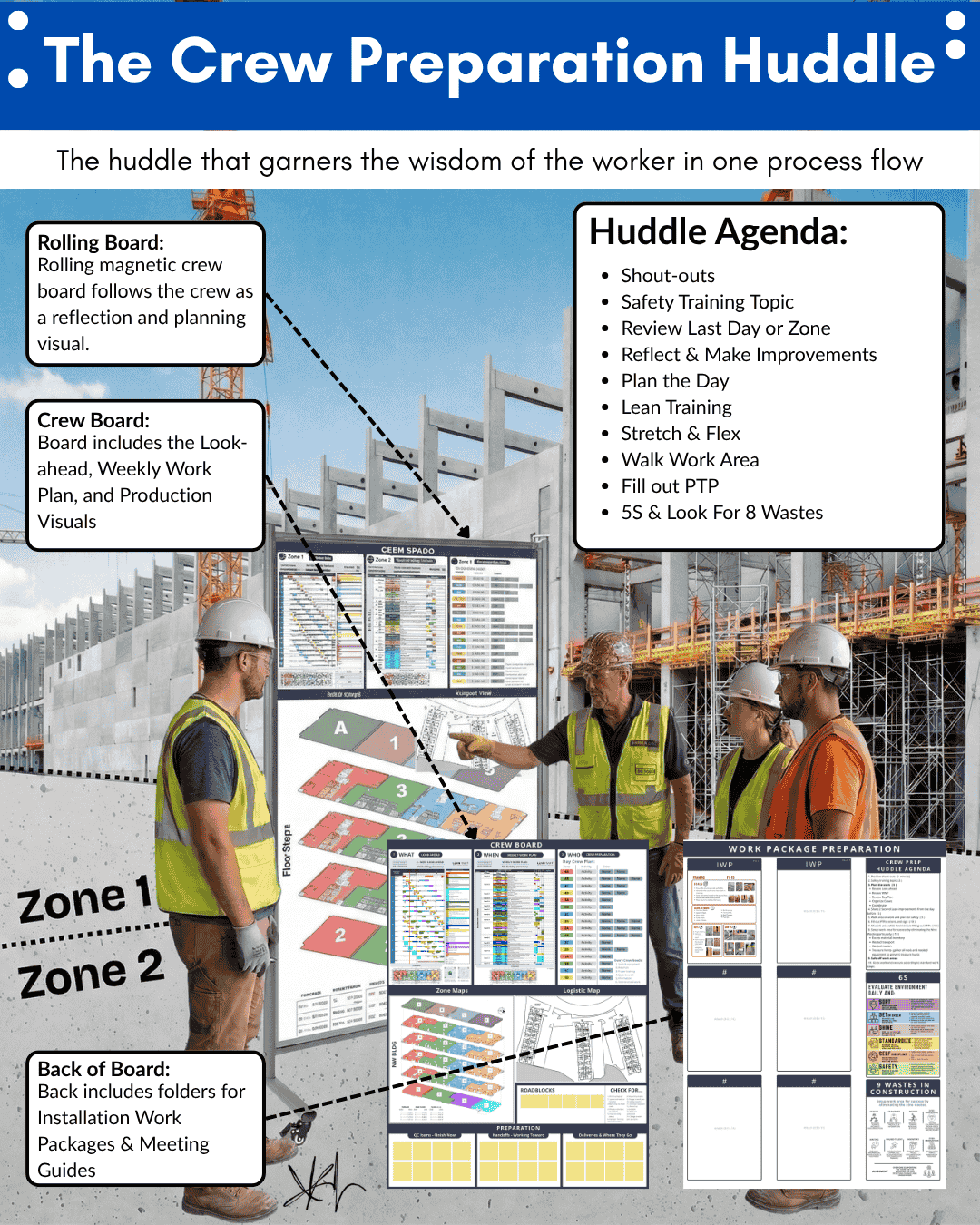 The crew board is the anchor of the entire system. It moves with the crew. On the front sits the look-ahead plan, the weekly work plan, production visuals, and zone maps that crews can mark up with magnets or dry-erase markers. This is not information buried in a schedule it’s in the zone, readable by the workers who are about to do the work. On the back sit Installation Work Packages, crew prep meeting guides, feature-of-work expectations, and visual quality standards for how the work should be done. The quality checklist built in the preconstruction meeting three weeks ago? Right there. The visual standard for a proper installation? On the board that travels with the crew.
