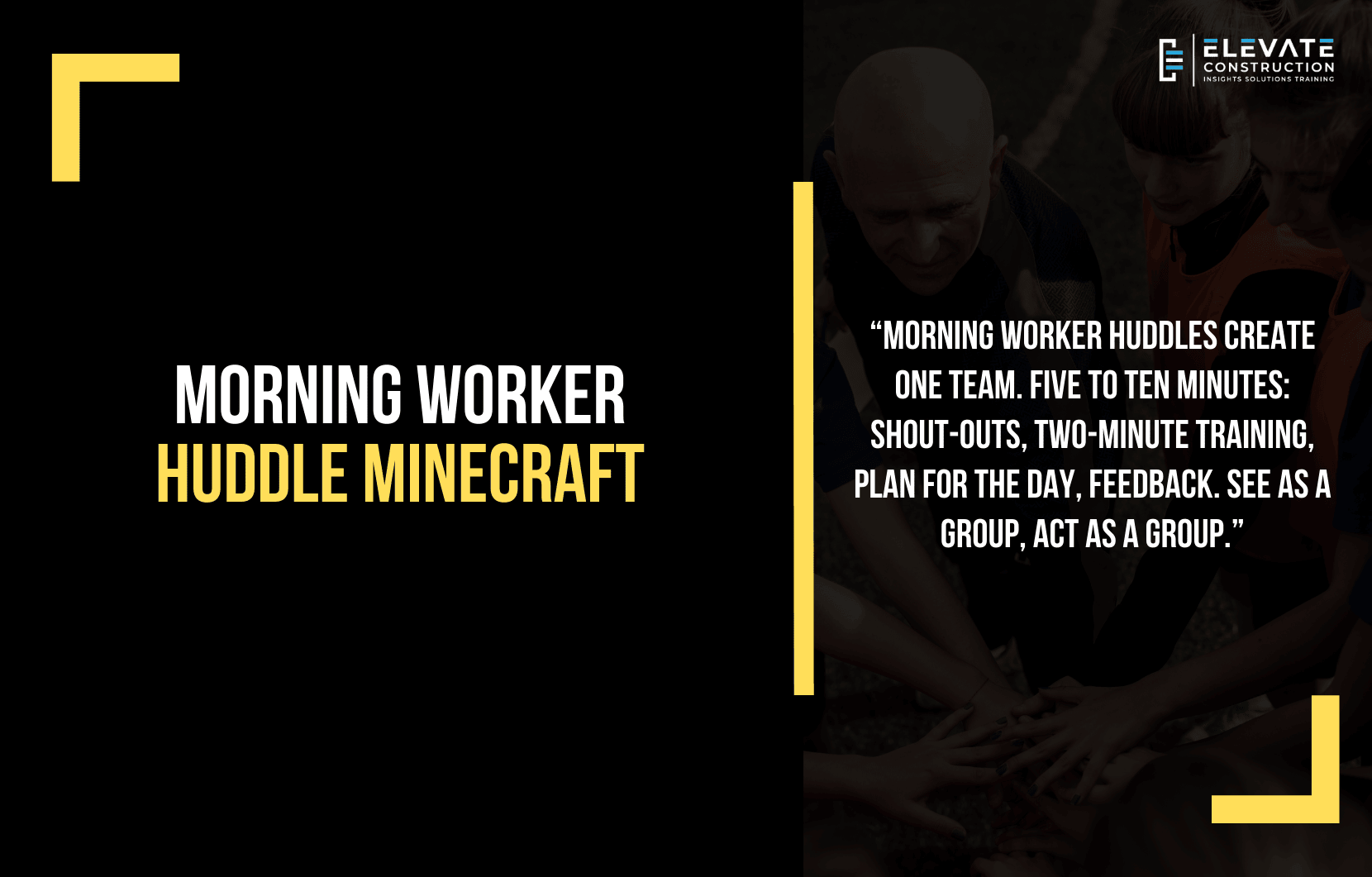 As we say at Elevate, morning worker huddles create one team. Five to ten minutes: shout-outs, two-minute training, plan for the day, feedback. See as a group, know as a group, act as a group. That’s how you transform the job site from separate crews heading in different directions to one team heading in the same direction.