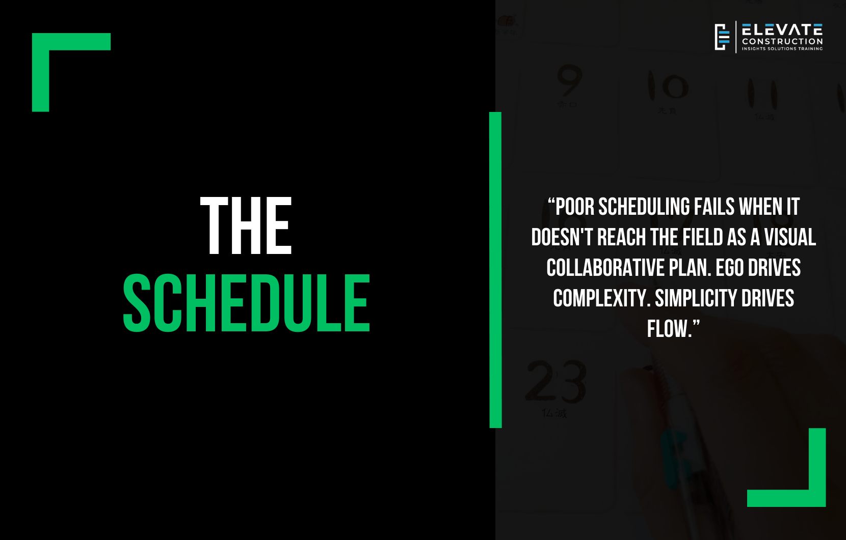 Remove yourself as the constraint. Let the team collaborate. And stop letting ego drive complexity. Simplicity drives flow. Ego drives bottlenecks. Choose flow. As we say at Elevate, no schedule is worth the paper it’s printed on unless it gets to the people in the field doing the work as a visual representation of collaborative planning amongst the entire team. Make it visual. Make it collaborative. Fix it together.